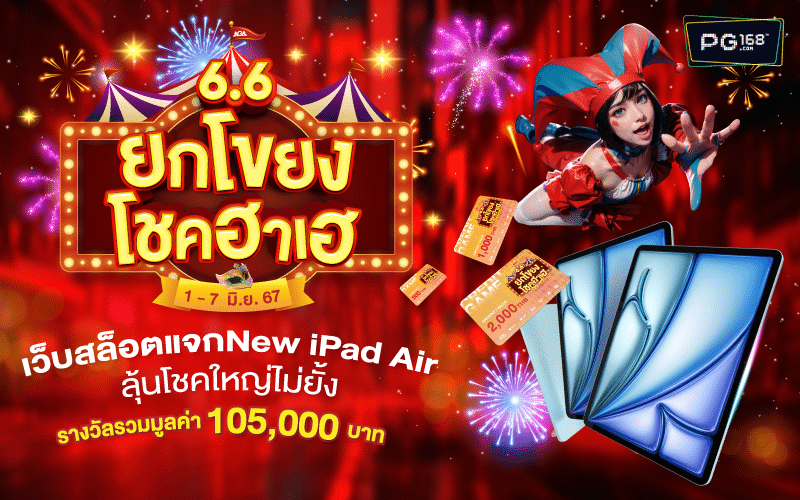 พิเศษสุดสำหรับผู้โชคดีทุกท่าน เพียงร่วมสนุกกับกิจกรรมของเราในช่วงเวลาที่กำหนด คุณอาจเป็นผู้โชคดีที่ได้ครอบครอง New iPad Air สุดล้ำค่าไปใช้เลย 1 เครื่องฟิน ๆ และ รางวัลเครดิตฟรีมากมายตลอดทั้งแคมเปญ 6.6 นี้ เตรียมตัวให้พร้อมสำหรับ โปรใหญ่ยกโขยง รับโชคฮาเฮ อย่าพลาดโอกาสทองที่จะคว้าโชคใหญ่ และความบันเทิงสุดมันส์ในช่วงหน้าฝนนี้ ร่วมสนุกกับเราที่ PG168 แล้วเปิดดวงรับโชคกันได้เลย